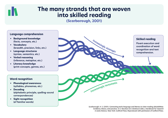 The reading rope model, developed by psychologist and literacy expert Dr Hollis Scarborough in 2001, is an evidence-informed model that can be used as a framework for planning. It outlines the knowledge and skills required to develop language comprehension and word recognition skills. Students need to be proficient in both areas to become skilled readers.