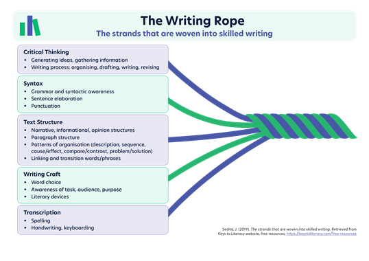 Incorporate the knowledge and skills listed in the model into your literacy planning. In the early years, focus on teaching transcription skills (handwriting and spelling). While students are developing these essential transcription skills, composition skills (critical thinking, syntax, text structure and writing craft) are mainly taught through teacher demonstration and oral composition by students.