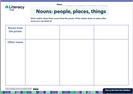 Introduce or reinforce the definition of a noun. Explain that a noun is a word that refers to a person, a place or a thing. Have students turn to a partner and take turns saying nouns to each other.