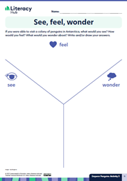 Discuss what the students know about penguins, and how they feel about them. Talk about the things they still wonder about. Have them fill in the See, feel, wonder graphic organiser.