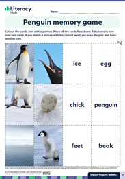 Write the following content vocabulary from the text onto a chart (ice, egg, chick, penguin, beak, feet). Talk about each word, and what it means. Students can then join with a partner to play a game of memory by matching the words with the correct image. Print a copy for each student to play a game of memory with a partner.