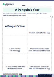 Have students make a book that outlines a year in a penguin’s life using the printable worksheet. Have them draw a picture in each box to match the sentence, cut out the boxes, and staple the pages together in order. Encourage students to refer to the time line in Emperor Penguins to ensure they have ordered the pages correctly in their book.