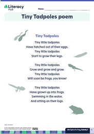 Introduce the whole group to the poem Tiny Tadpoles by showing it on a large screen. Read the poem aloud, modelling fluent, phrased reading. Reread the poem and encourage students to join in when they feel confident.