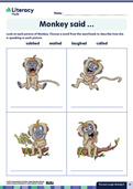 Have students talk with a partner about other saying verbs. Invite pairs to share their ideas and add these to the class list. Introduce the Monkey said … worksheet, and have them complete it, before sharing their work in a small-group setting.